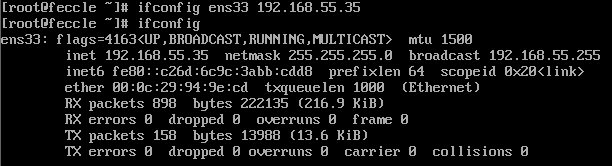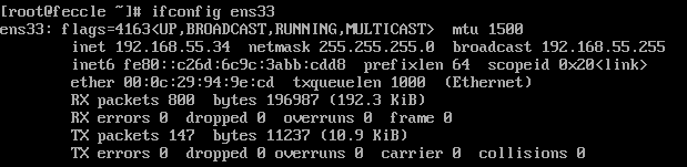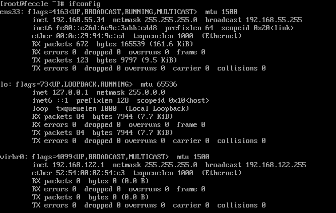 | [root@feccle roo]# ifconfig ens160: flags=4163<UP,BROADCAST,RUNNING,MULTICAST> mtu 1500 inet 192.168.55.87 netmask 255.255.255.0 broadcast 192.168.55.255 inet6 fe80::20c:29ff:fe8e:e92 prefixlen 64 scopeid 0x20<link> ether 00:0c:29:8e:0e:92 txqueuelen 1000 (Ethernet) RX packets 318874 bytes 152325632 (145.2 MiB) RX errors 405 dropped 4714 overruns 0 frame 405 TX packets 256172 bytes 61745320 (58.8 MiB) TX errors 0 dropped 0 overruns 0 carrier 0 collisions 0 lo: flags=73<UP,LOOPBACK,RUNNING> mtu 65536 inet 127.0.0.1 netmask 255.0.0.0 inet6 ::1 prefixlen 128 scopeid 0x10<host> loop txqueuelen 1000 (Local Loopback) RX packets 179 bytes 18088 (17.6 KiB) RX errors 0 dropped 0 overruns 0 frame 0 TX packets 179 bytes 18088 (17.6 KiB) TX errors 0 dropped 0 overruns 0 carrier 0 collisions 0 |