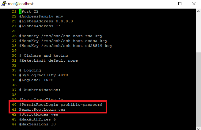 ⅱ) PermitRootLogin 지시자를 찾아 값을 “yes”로 설정한 후 sshd 데몬을 재시작합니다.