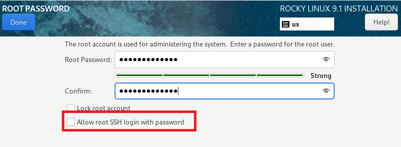 Rocky 리눅스 설치 시 Root Password 를 지정하는 부분에 "Allow root SSH Login with password" 를 체크하지 않을 경우 ssh 접속 시 패스워드가 틀렸다고 나옵니다.