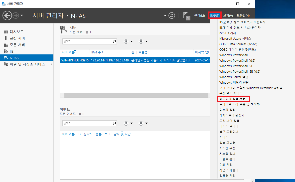 서버 관리자 에서 "도구" 메뉴에서 "네트워크 정책 서버" (NPS)를 선택합니다.