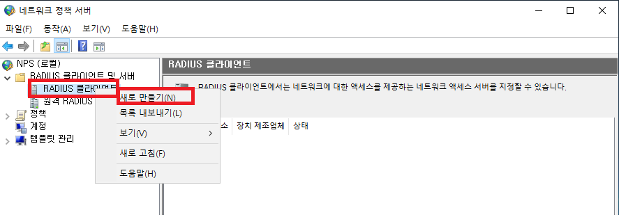 ⅲ) NPS 콘솔이 열리면 "RADIUS 클라이언트"를 선택하고 "새 클라이언트"를 추가합니다.