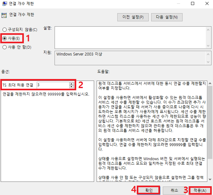 윈도우 PC에 여려 명이 접속하여 작업을 한다고 하면 접속 가능한 연결 세션 수를 제한 하는 것이 좋습니다. 설정을 안 할경우 접속하는 사용자마다 CPU, MEMORY 점유율이 갖기 때문에 사용안하는 세션을 정리하거나, 원격 데스크톱 세션 수 제한 설정을 하는 것이 좋습니다.