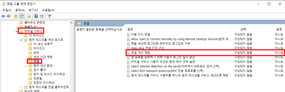 좌측 패널에서 컴퓨터 구성 → 관리 템플릿 → Windows 구성 요소 → 터미널 서비스 → 원격 데스크톱 세션 호스트 → 연결로 이동합니다.
