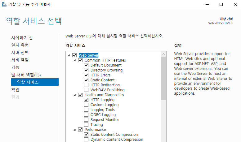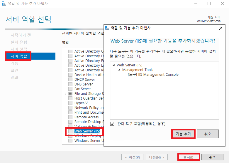 필요에 따라 추가 기능(예: ASP.NET, FTP Server)을 선택합니다.