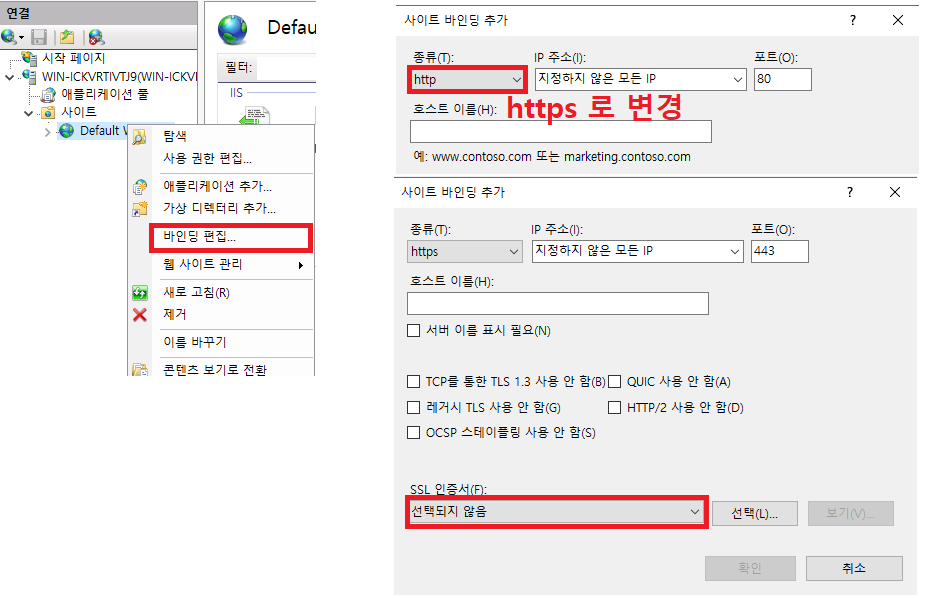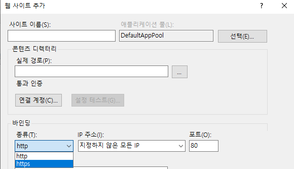 바인딩 설정에서 사용자의 요구에 따라 HTTP 또는 HTTPS를 선택합니다.