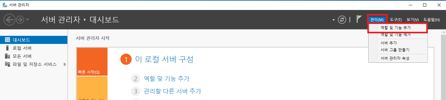 서버 관리자를 열고 "역할 및 기능 추가"를 선택합니다.