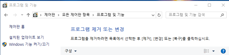 제어판 > "프로그램 및 기능" > "Windows 기능 켜기/끄기"로 이동합니다.