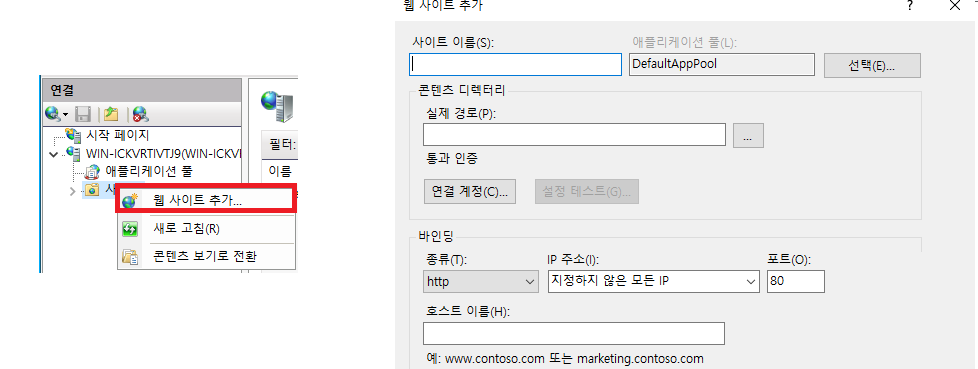 IIS 관리자에서 "사이트"를 우클릭하고 "사이트 추가"를 선택합니다.