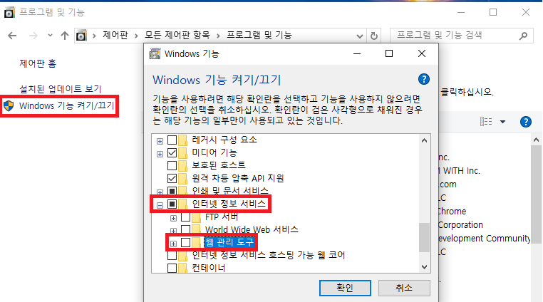 "인터넷 정보 서비스" 항목을 선택하고 필요한 구성 요소를 추가합니다.