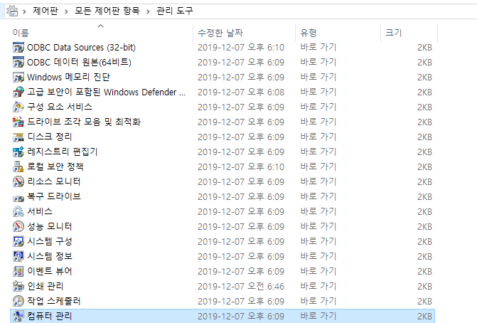 제어판에서 관리 도구 > 컴퓨터 관리로 이동한 후, 디스크 관리를 선택하여 실행할 수 있습니다.