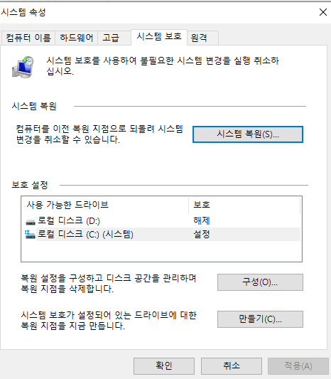 시스템 속성 창의 시스템 보호 탭에서 보호하려는 드라이브(C: 드라이브)를 선택하고 구성을 클릭합니다.