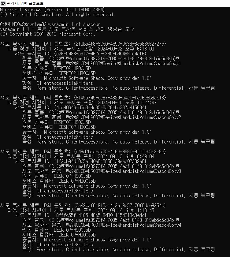 이 명령어를 사용하면 시스템에 생성된 모든 섀도우 복사본의 목록을 볼 수 있습니다.