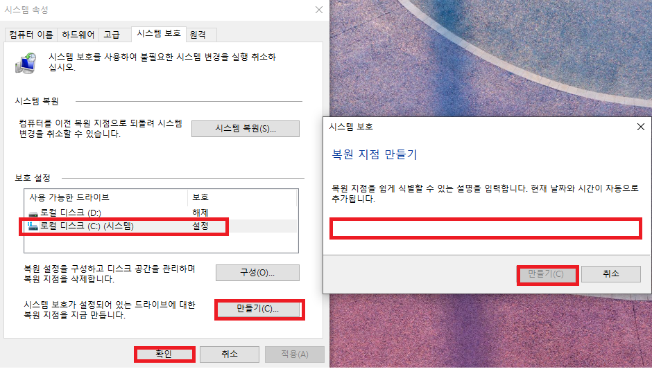 복원 지점을 수동으로 생성하려면 만들기 버튼을 눌러 복원 지점을 생성할 수 있습니다.