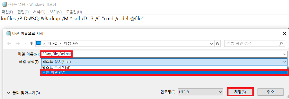 ⅱ. 저장 시 파일 형식을 모든 파일로 변경 후 파일 이름은 확장자를 .bat 으로 변경과 파일 형식 모든파일(*.*) 로 변경 후 저장 버튼을 클립합니다.