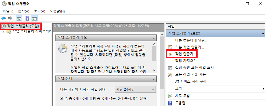 ⅵ. 작업스케쥴러 (로컬) 선택 후 작업 만들기를 선택합니다.