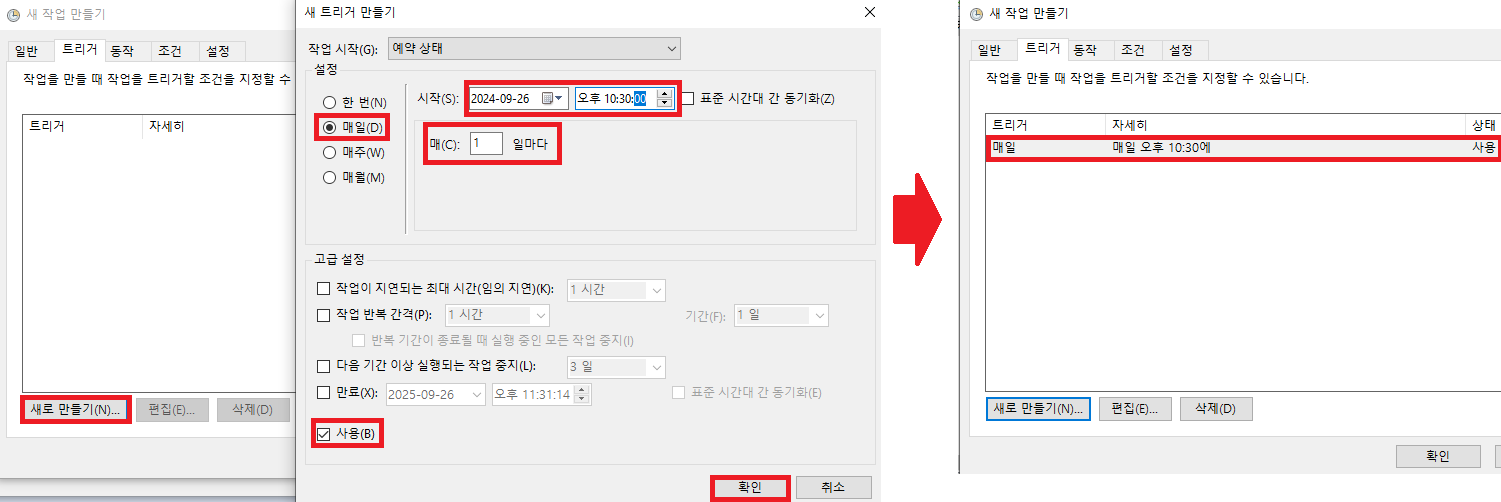 ⅷ. 트리거 탭에서는 작업에 대한 실행 주기를 설정합니다.