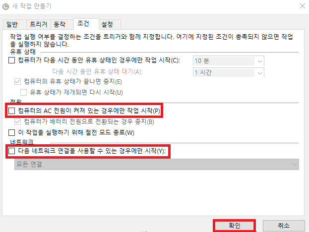 ⅹ. 조건 탭에서는 전원 옵션과 네트워크 옵션으로 체크가 해제되어 있는지 확인 후 확인 버튼을 클릭합니다.