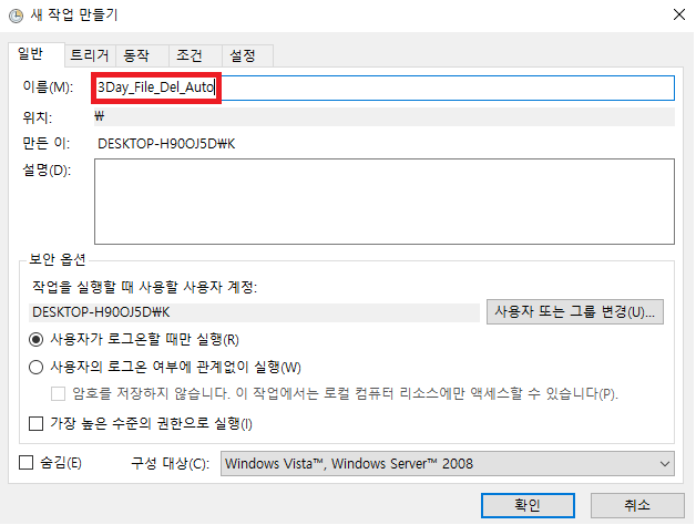 ⅶ. 일반 탭, 트리거 탭, 동작 탭, 조건 탭 모두 설정이 필요하며, 일반 탭에서는 만들 작업에 대해 이름을 설정합니다.