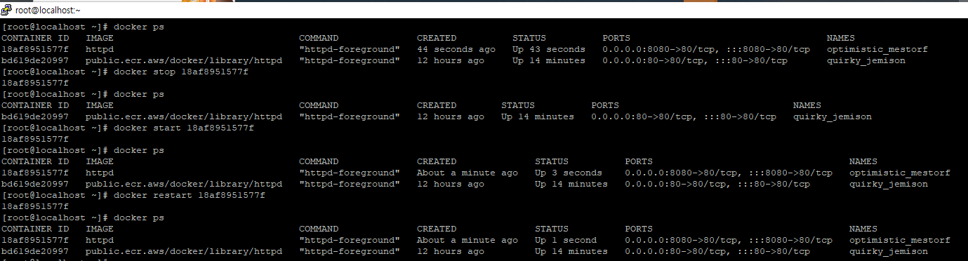 | docker start | 중지된 컨테이너를 다시 시작합니다. | docker start <container-id> |