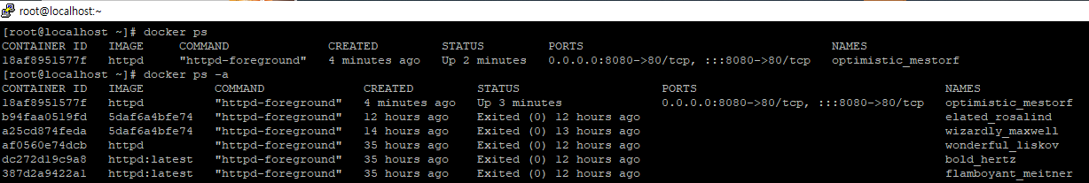 | docker ps -a | 모든 컨테이너(실행 중이지 않은 것 포함)의 목록을 확인합니다. | docker ps -a |