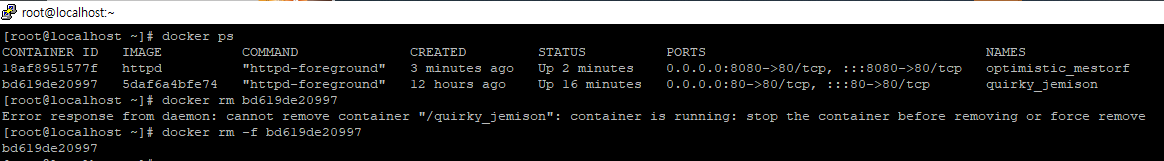 | docker rm | 특정 컨테이너를 삭제합니다. | 서비스 종료된 컨테이너 삭제 docker rm <container-id> 서비스 실행 중인 컨테이너 강제 삭제 docker rm -f <container-id> |