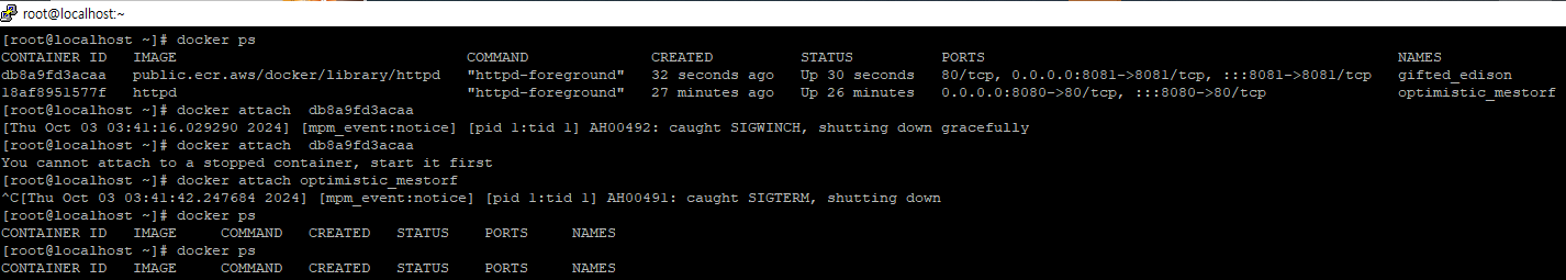 * docker attach에서 연결을 끊으면, 연결된 프로세스가 종료되거나 컨테이너도 함께 종료될 수 있습니다. 이를 방지하기 위해서는 백그라운드에서 실행되는 컨테이너에 연결해야 합니다.