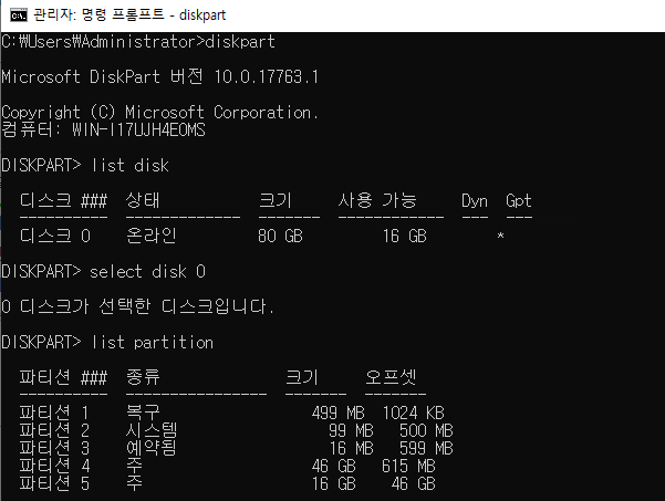 선택한 디스크의 파티션 목록을 확인합니다.
