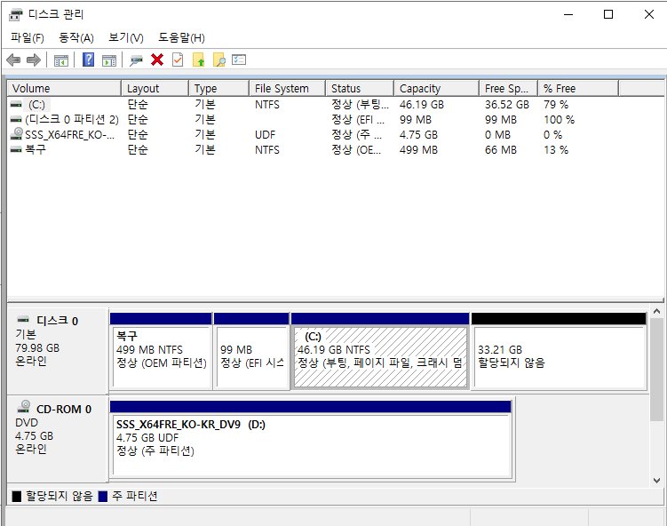 가장 많은 원인으로는 디스크 확장을 위해서는 확장하려는 파티션 바로 뒤에 미할당(Unallocated) 공간이 있어야 합니다.