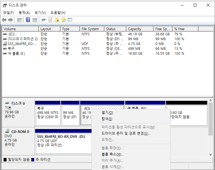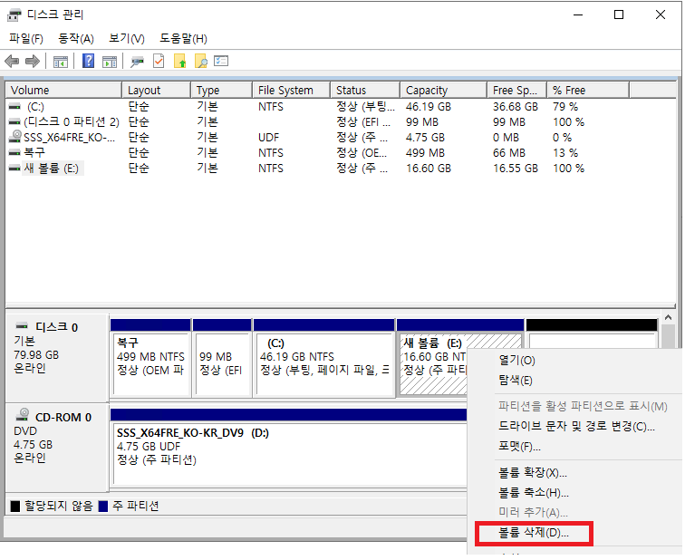 ⅰ. 추가 디스크를 할당하고자 하는 드라이브의 바로 뒤에 미할당 공간을 생성하기 위해 볼륨 삭제