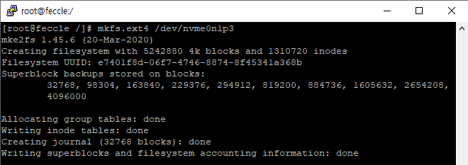 | [root@feccle ~]# mkfs.ext4 /dev/nvme0n1p3 |