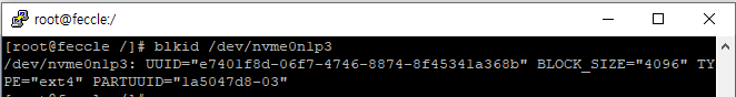 | [root@feccle /]# blkid /dev/nvme0n1p3 |