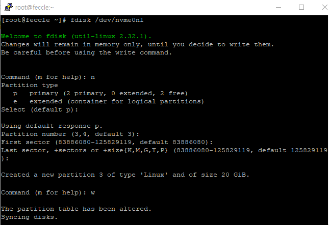 | [root@feccle ~]# fdisk /dev/nvme0n1 |