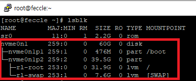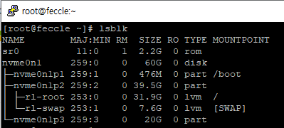nvme0n1 장치에서 보면 디스크의 크기가 60GB인데 40GB 만큼 할당이 된것을 확인 할 수 있습니다.