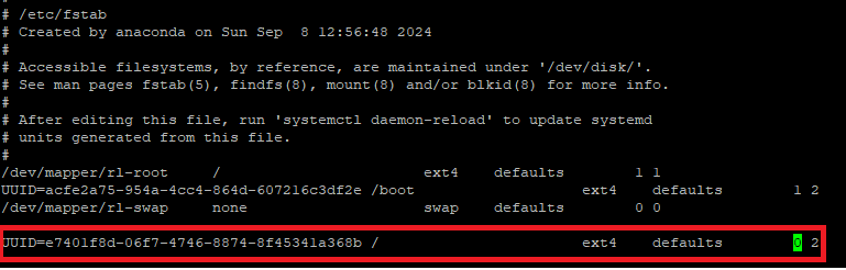 | UUID=e7401f8d-06f7-4746-8874-8f45341a368b /data ext4 defaults 0 2 |