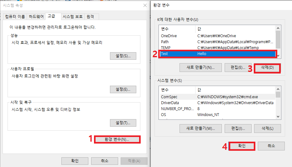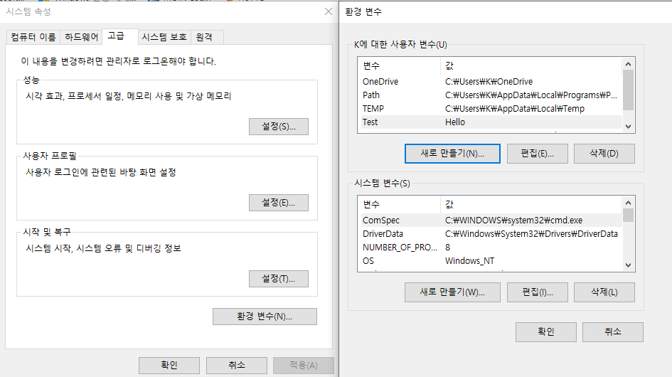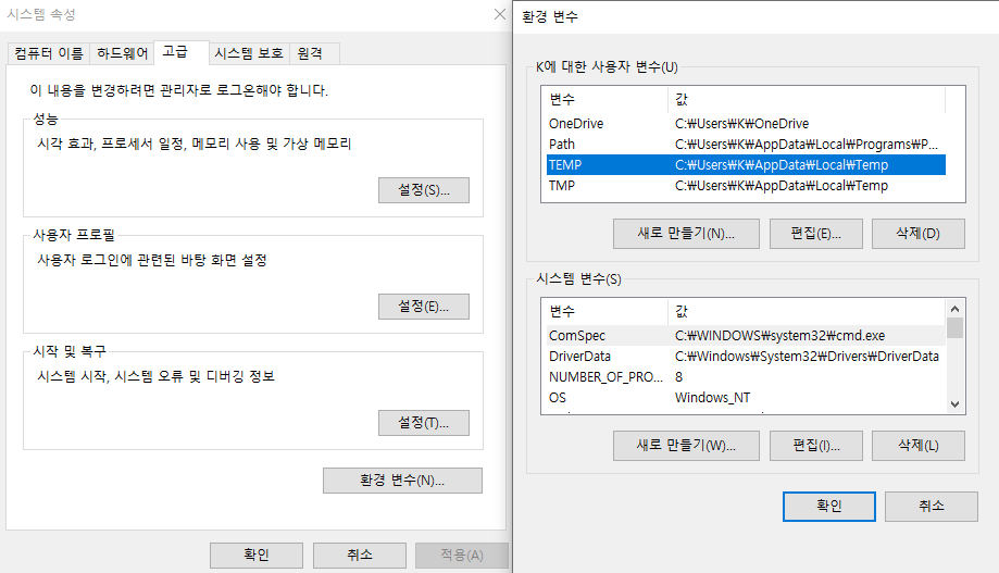 1) 시스템 설정을 통해 앞서 설명한 "환경 변수" 창을 엽니다.