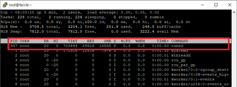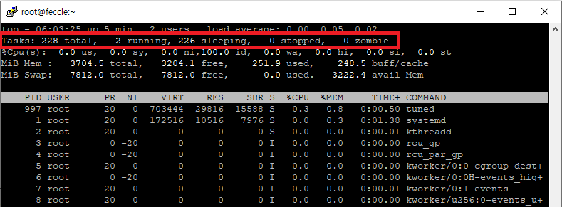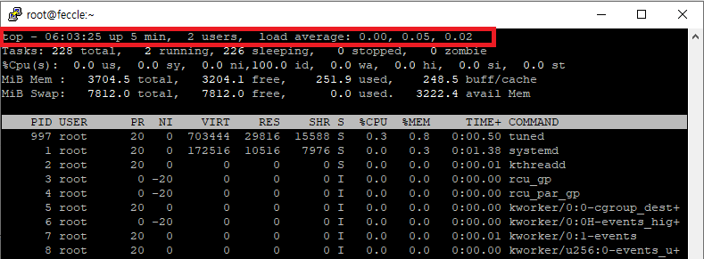| top 명령어 첫 줄에서 현재 시간, 시스템 가동 시간 (uptime), 현재 로그인한 사용자 수를 확인할 수 있습니다. top - 06:04:19 up 6 min, 2 users, load average: 0.00, 0.04, 0.01 시스템 시간, 가동 시간, 사용자 수, 로드 평균 (load average) 지난 1분, 5분, 15분 동안의 CPU 부하를 나타냅니다. 값이 낮을수록 시스템이 여유롭고, 값이 높으면 CPU가 과부하 상태일 수 있습니다. |