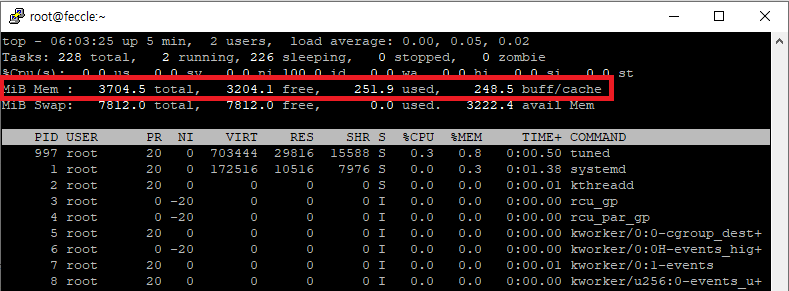 | MiB Mem : 3704.5 total, 3203.8 free, 251.3 used, 249.3 buff/cache total: 총 메모리 크기 free: 사용 가능한 메모리 used: 사용 중인 메모리 buff/cache: 버퍼와 캐시로 사용 중인 메모리 |