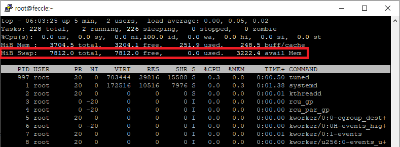 | MiB Swap: 7812.0 total, 7812.0 free, 0.0 used. 3222.9 avail Mem total: 총 스왑 메모리 크기 free: 사용 가능한 스왑 메모리 used: 사용 중인 스왑 메모리 avail: 시스템에서 즉시 사용할 수 있는 메모리 (swap 포함) |