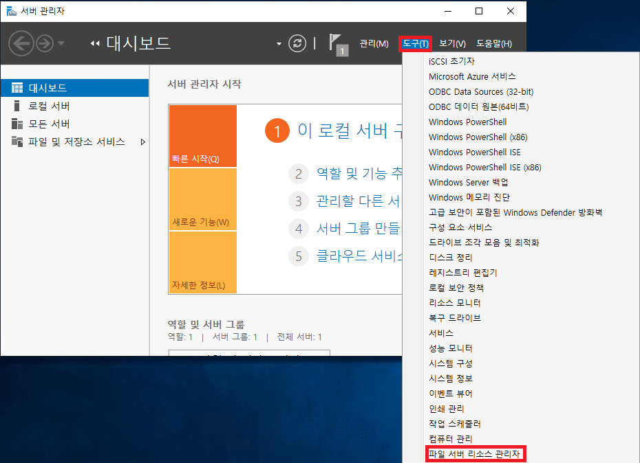 서버 관리자 → 역할 및 기능 추가 → 파일 및 저장소 서비스 → 파일 서버 리소스 관리자