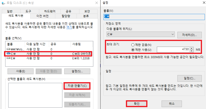 : 섀도 복사본은 추가 저장소를 사용합니다. 저장소 크기를 주기적으로 점검하고 불필요한 복사본을 삭제 관리 필요