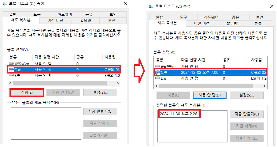 사용) 해당 볼륨에서 섀도 복사본 활성화