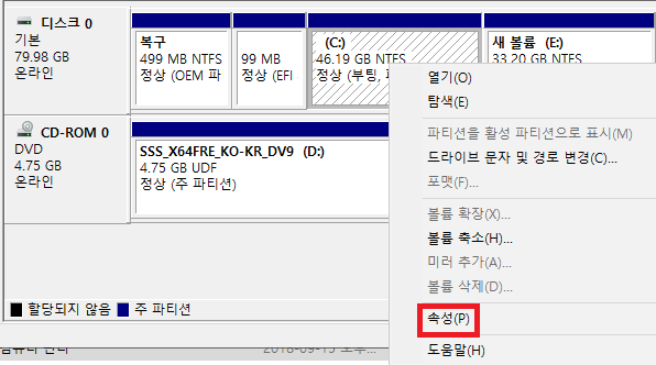 ⅳ. 그림자 복사본을 활성화할 디스크 볼륨을 선택한 후, 해당 볼륨을 우클릭 → 속성 클릭