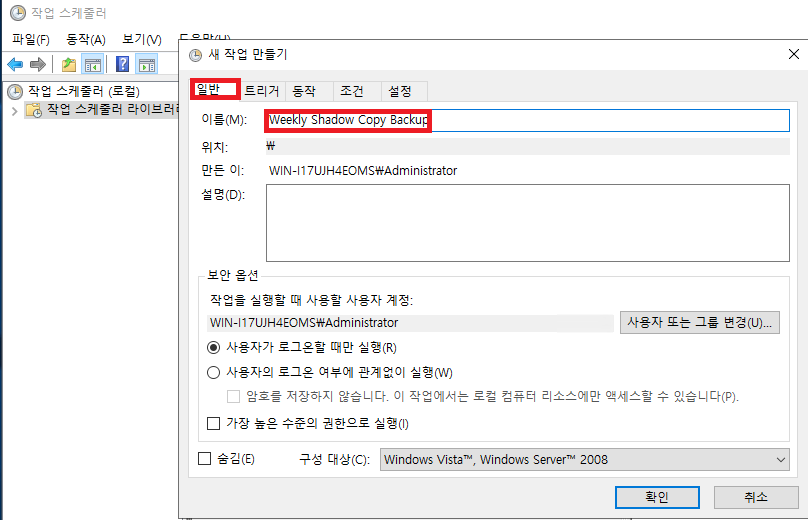 ⅲ. 일반 탭에서 작업 이름 입력(예: "weekly Shadow Copy Backup")