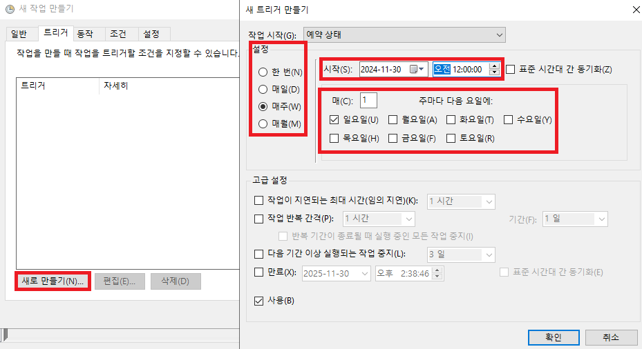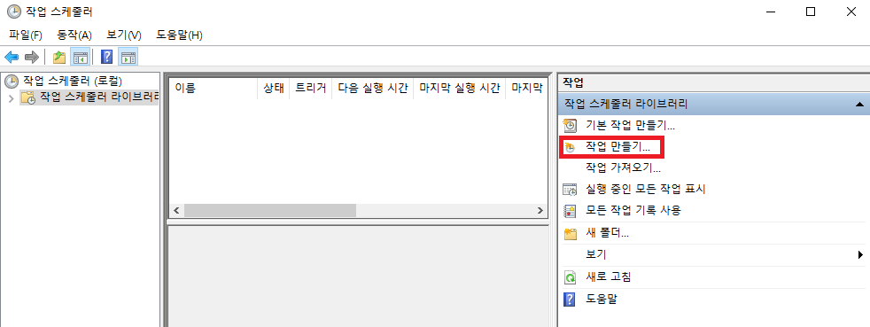 1) 새로 만들기 → 동작을 "프로그램 시작"으로 선택
