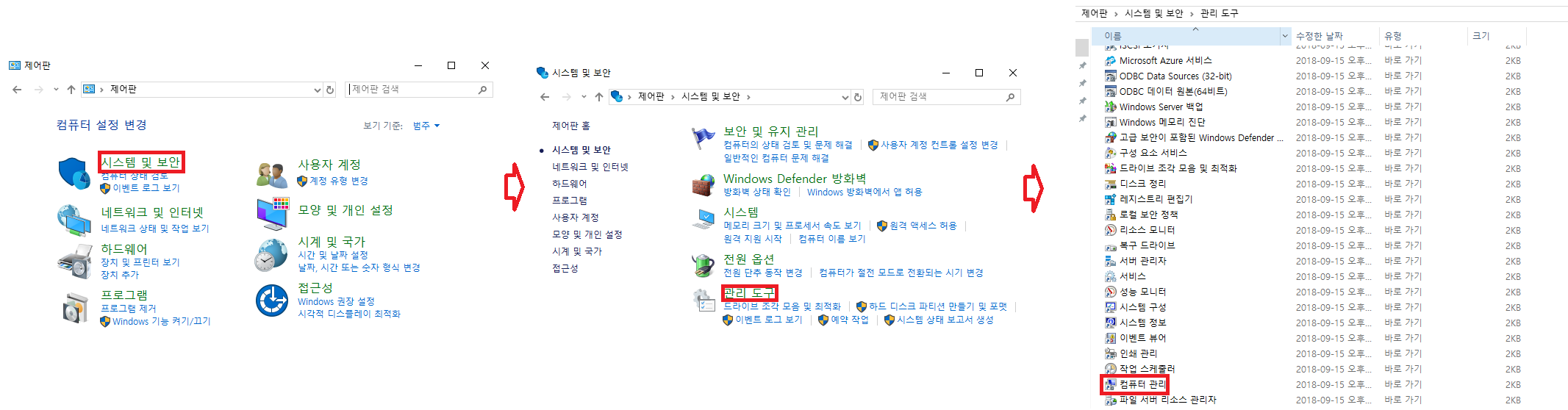 ⅱ. 시스템 및 보안 → 관리 도구 → 컴퓨터 관리 실행.
