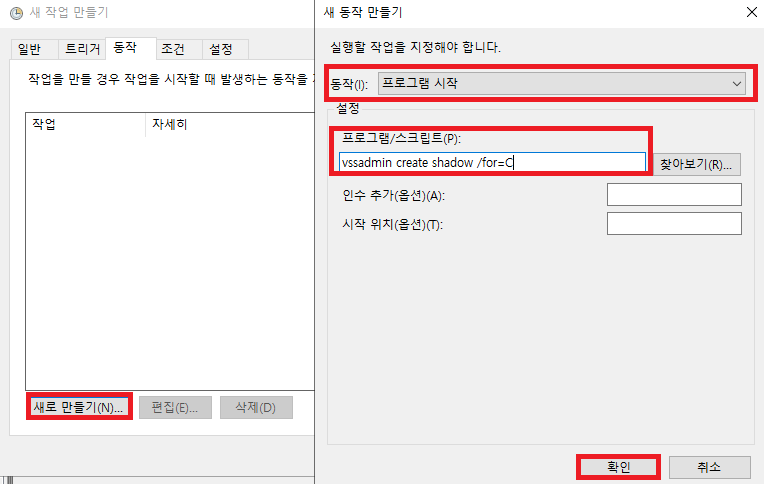 2) 프로그램/스크립트 경로에 vssadmin create shadow /for=C: 입력