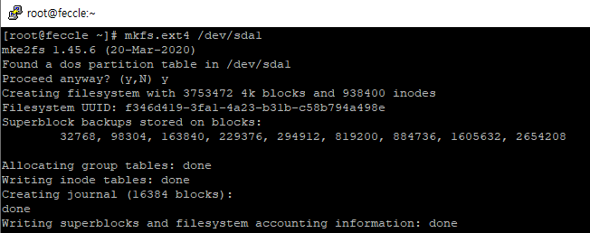 | [root@feccle ~] # mkfs.ext4 /dev/sda1 Found a dos partition table in /dev/sda1 Proceed anyway? (y,N) 기존 USB에 데이터가 남아 있을 경우에 아래와 같은 문구가 발생할 수 있으며, 이 파티션 위에 파일시스템을 새로 생성하려면 기존 데이터를 덮어써야 합니다. |