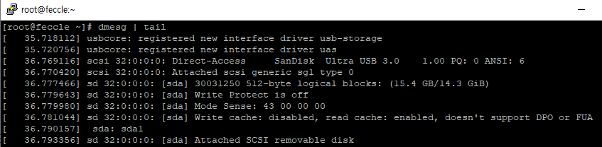 최근에 연결된 장치 정보가 출력됩니다. sda, sdb 같은 이름으로 디바이스가 표시될 것입니다.