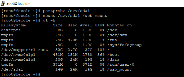 | [root@feccle ~] # partprobe /dev/sda1 [root@feccle ~] # mount /dev/sda1 /usb_mount [root@feccle ~] # df -h |