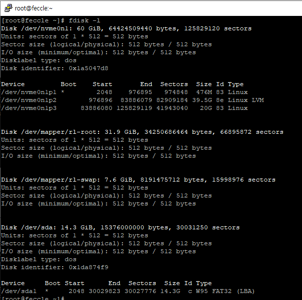 | [root@feccle ~]# fdisk /dev/sda1 Welcome to fdisk (util-linux 2.32.1). Changes will remain in memory only, until you decide to write them. Be careful before using the write command. Command (m for help): n Partition type p primary (0 primary, 0 extended, 4 free) e extended (container for logical partitions) Select (default p): p Partition number (1-4, default 1): First sector (2048-30027775, default 2048): Last sector, +sectors or +size{K,M,G,T,P} (2048-30027775, default 30027775): Created a new partition 1 of type 'Linux' and of size 14.3 GiB. Command (m for help): w The partition table has been altered. n: 새 파티션 생성 p: 기본 파티션 선택 원하는 크기 입력 (기본값 사용 가능) w: 변경 내용 저장 및 종료 |